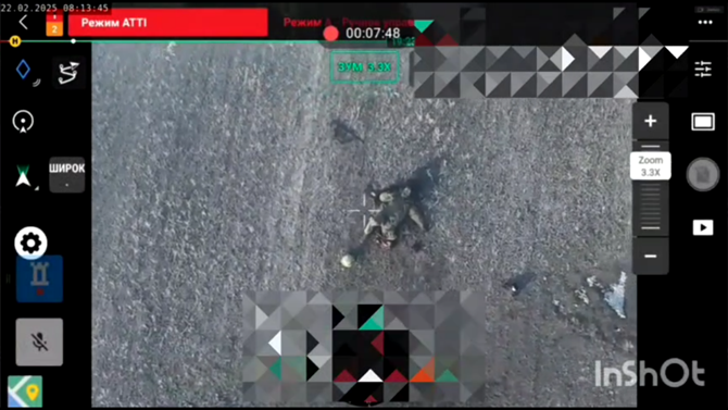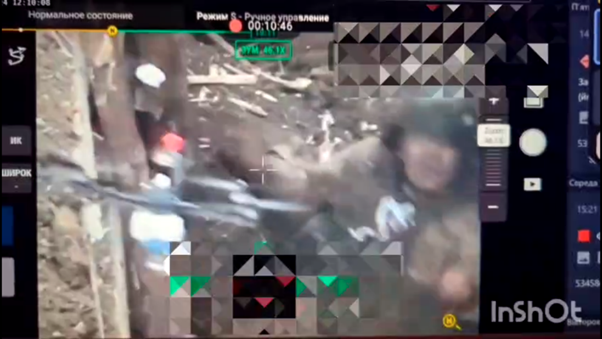 A kamikaze drone flies towards a Russian soldier in a trench. Video courtesy of Drop.