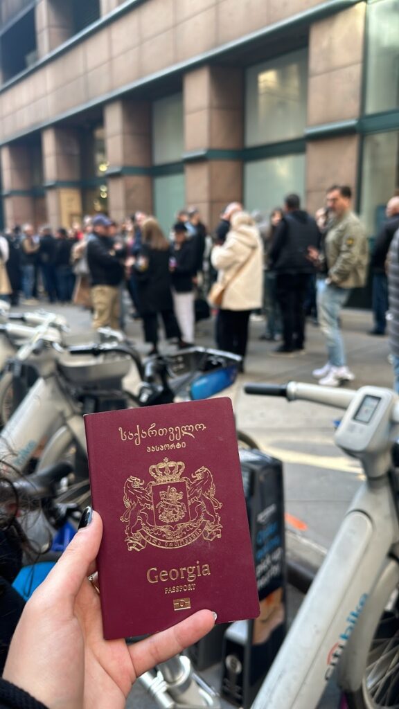It is an early cold October morning, and a crowd is gathering at the Georgian consulate on East 44th Street. Hours trickle by, but the crowd only grows. By noon, the NYPD blocks the street off. The crowd is unexpectedly large, and they were not warned. Passerbys ask what the line is for. “We are here to vote!” someone answers. Another holds up a red leather-bound passport. The seal glistens as he says, “We are Georgian.”