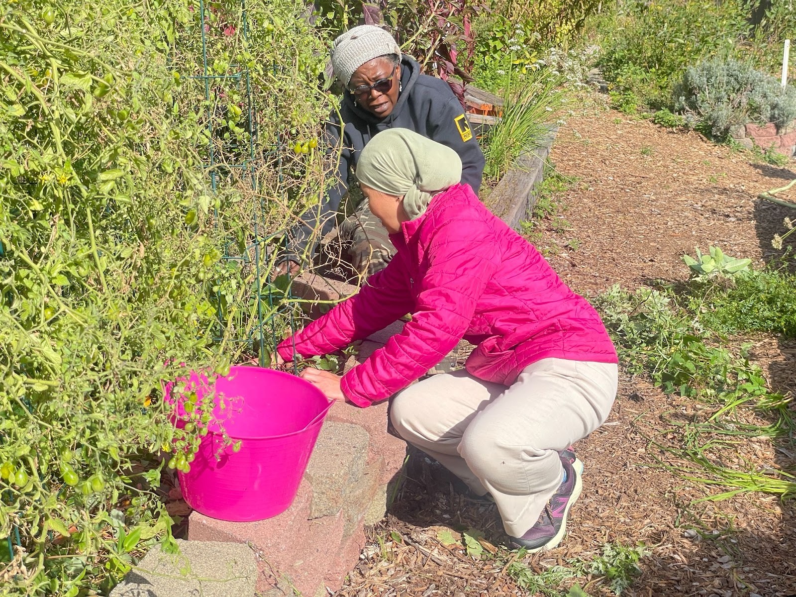 Volunteer farmers at New Roots harvest green tomatoes