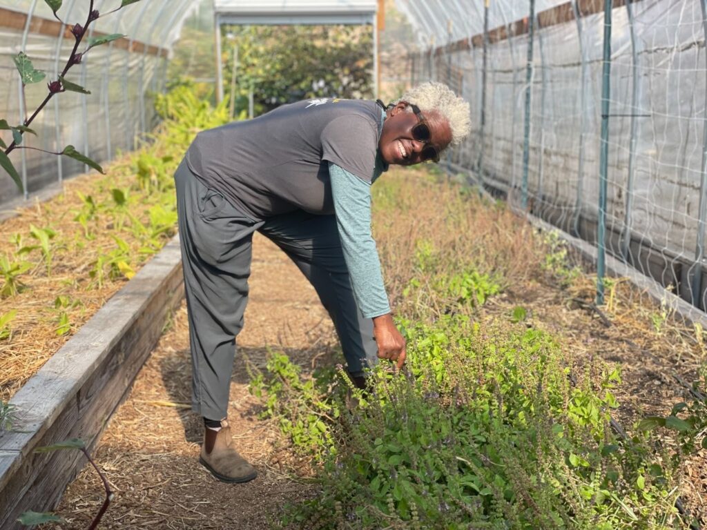 Cultural exchange often happens unintentionally. Sheryll recalls when the farm first grew hibiscus or bissap, a hardy bush usually grown for its flowers. When stems began appearing mysteriously chopped down, she assumed someone was vandalizing the crop; until West African gardeners explained that they harvest the leaves for stew before the plant flowers. “Now, we grow bissap with intention,” Sheryll says: flowers for tea in the greenhouse, leaves for stewing outside.