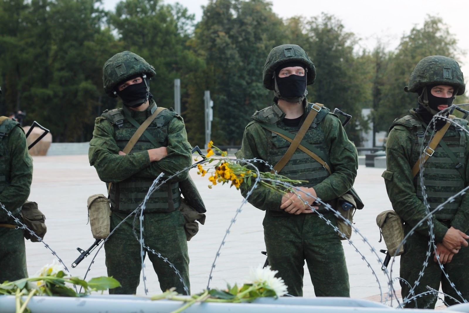 Belarusian security services, missing unit insignia, monitor a protest in central Minsk in August 2020. Photo: Natallia Rak, Flickr.