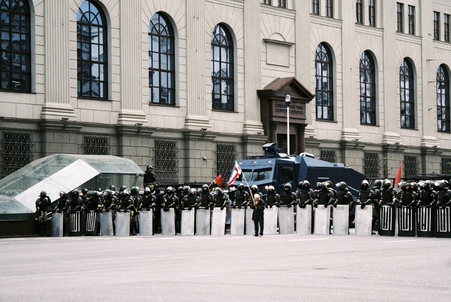 One week later, Minsk turned red and white as two hundred thousand protesters draped themselves in the colors of the opposition and filled the city’s Independence Square. Once the site of garish Soviet military parades, the plaza is still adorned with a bronze statue of Vladimir Lenin.